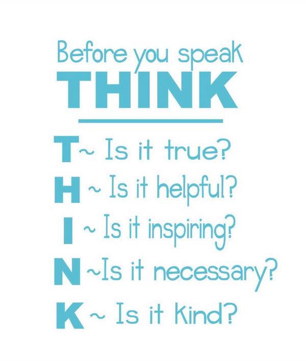 Krishnamurti suggested that it is better to speak little. 8X10 Poster PDF Think before you speak is it True is it Helpful is it Inspiring is it Necessary is it Kind This is a great way to teach children why we speak kindly to each other and to help the interrupting Subjects. Psychology Child Care Back to School. Even though infants and small children are able to communicate quite effectively without words most quickly start vocalizing to better express their wants and ideas. And for another it includes only three out of the standard four or five guidelines for speech which are that speech should be true kind helpful conducive to harmony and and this is sometimes omitted spoken at the right time. Second ask yourself IS IT NECESSARY Sometimes people need to know their behavior is ineffective or inappropriate. If the answer is no maybe what you are about to say should be left unsaid.