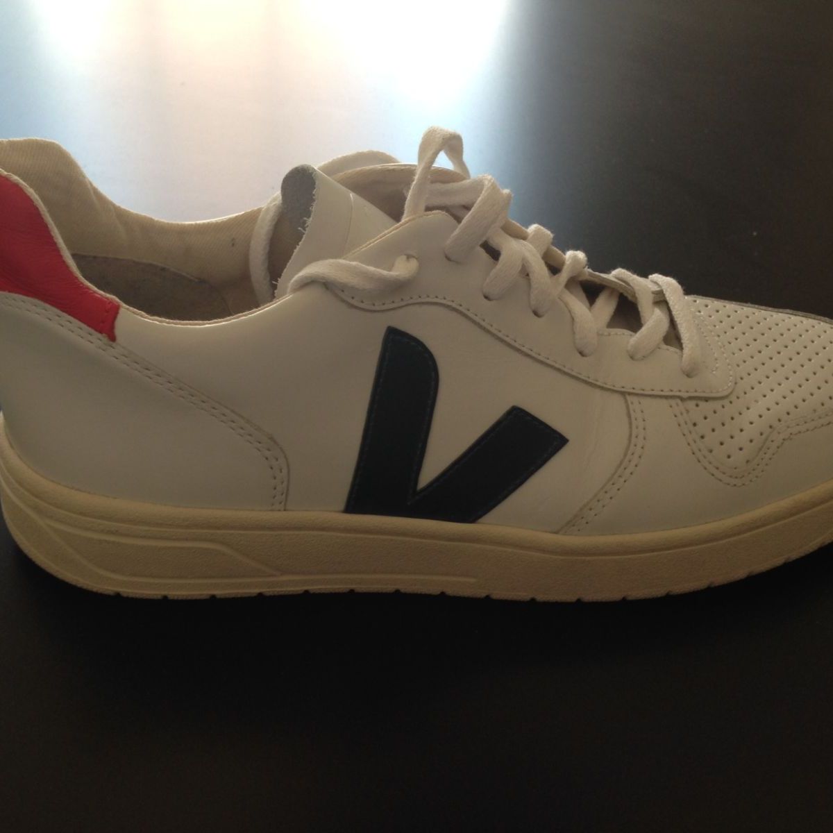 Features the signature V logo in navy and red back logo made from rubber. The V-10 Leather Extra White Nautico Pekin model is made out of ecological and sustainable materials. Veja V-10 Leather Shoes in Extra White and Nautico Pekin. Regular price 6800 Sale price 6800 Regular price 15000 Unit price per. Boasts a leather upper with a perforated vamp a V-shaped logo made of rubber in contrasting colour cotton lining and an outsole manufactured of wild rubber. A celebration of VEJAs tenth year anniversary this beloved classic sneakers features an eco-leather upper body and organic cotton and wild rubber soles. The upper is made with leather lined with organic cotton.
